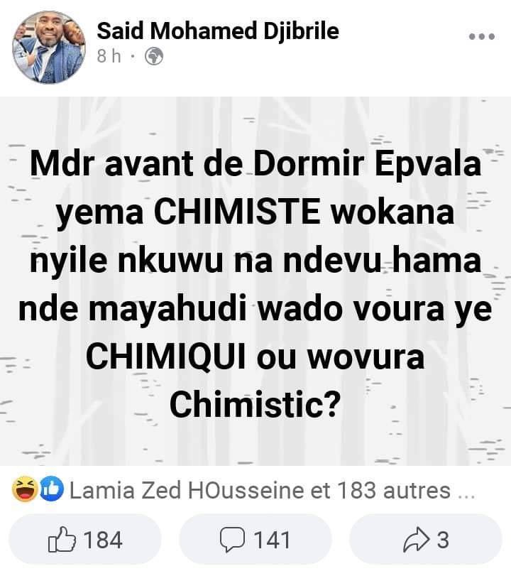 Bravo,vous avez un doctorat en chimie et si vous voulez nous apprendre la théologie bienvenue,mais j’aurais souhaité que vous nous apprenez la chimie votre domaine tous les jours et nous serons des milliers à vous suivre comme on suit Foundi Djibril, Foundi Moussa et d’autres pour la théologie.vous avez lancé un appel à l’encontre de Monsieur Djibril qualifiant de « mensonges »ce qu’il nous apprend tous les soirs,si je ne me trompes pas dans votre précédente déclaration.si je vous comprends vous voulez nous mettre en doute(dhoinna) sur les prêches de Foundi Djibril,ce qui est interdit dans notre religion.