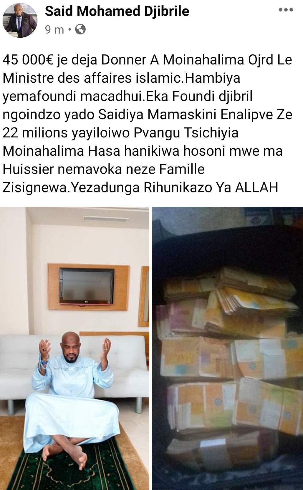 L’affaire de Moinahalima et Foundhi Djibril est peut-être fini aujourd’hui. Le prédicateur religieux a publié une photo montrant une somme importante dans une valise. Il aurait payé 45 000 euros à Moinahalima. L’opération financière a eu lieu devant des huissiers et d’autres personnes. Foundhi Djibril est accusé d’avoir volé plusieurs kilos d’or à la famille de Moinahalima.