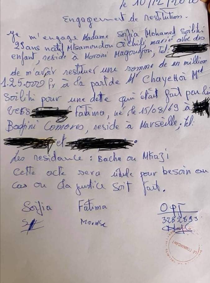 Hadji Ahamada Chayehoi alias foundhi Djibril vient de payer une partie de ses dettes. L’arrangement c’est déroulé à la gendarmerie nationale. Ses élèves ont souvent nié les affaires sombres du prédicateur religieux.