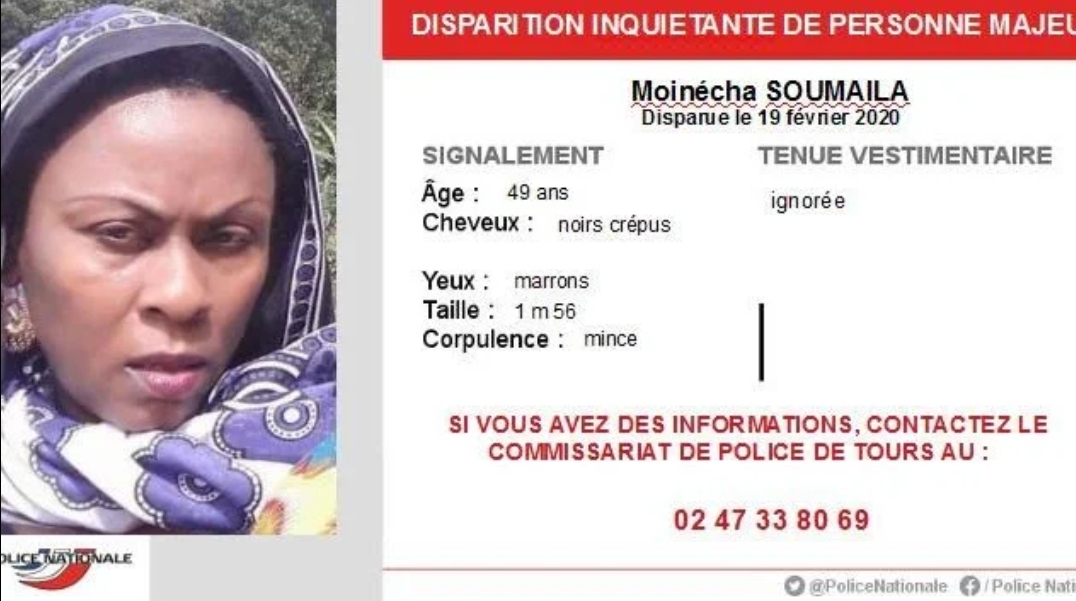La police nationale de Tours avait lancé un appel à témoins après une disparition inquiétante. Madame Moinécha Soumaila, domiciliée à Tours, n’avait pas donné de nouvelles à sa famille depuis le 19 février 2020. Cette femme mesure 1m56 et est âgée de 49 ans.