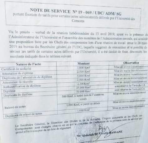 Vous êtes inscrits aux études supérieures des universités de Comores sachez alors, la délivrance de votre diplôme à la fin de vos études, vous devriez débourser la somme de vingt cinq mille franc « 25000fr » pour retirer votre diplôme. et si, vous l’avez déjà retiré et que ceci est perdu, vous en voulez un duplicata alors, il vous sera exigé de débourser la somme de cinquante mille franc! « 50000fc ».