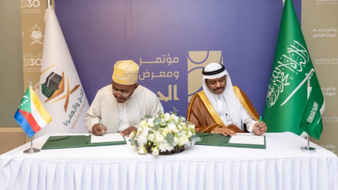 Accompagné par des acteurs clés du Hadj, Mohamed El-Fatih a signé la convention du Hedj 2025 lors d’une cérémonie officielle présidée par le Dr Abdul-Fattah Ben Suliman Mashat, vice-ministre saoudien du Hadj et de l’Omra. Cette convention fixe les modalités et conditions de participation des pèlerins comoriens tout en respectant des normes rigoureuses de sécurité et de confort. « La convention marque une étape déterminante pour offrir aux pèlerins comoriens une expérience spirituelle exceptionnelle », a affirmé le vice-ministre saoudien.
