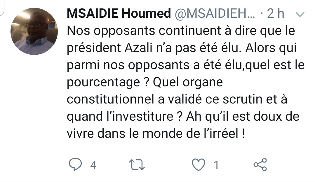 C’est sur Twitter que désormais Houmed Msaidié a pris l’habitude de répondre aux opposants au régime. L’ancien ministre de l’intérieur pose une question légitime à l’opposition qui se vide avec le temps et dont une majorité de la population ne soutient plus.