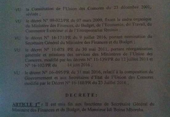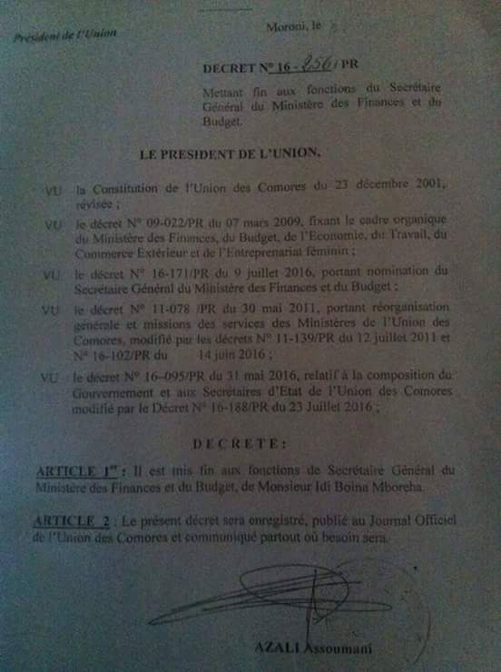 Le président Azali a licencié IDi BOINA, candidat malheureux de la CRC à Mbadjini.