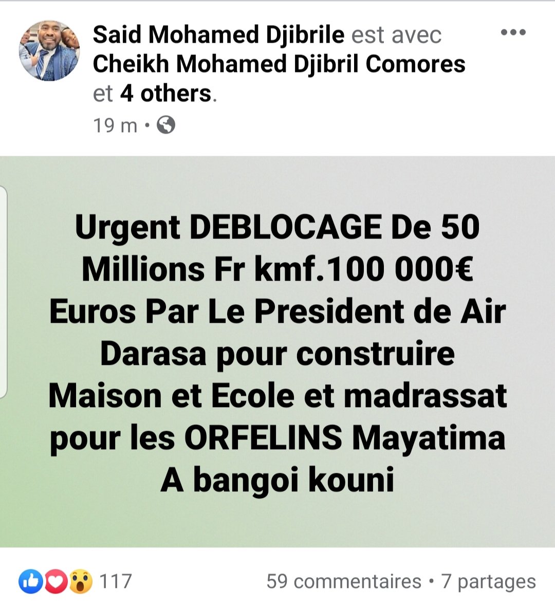 Foundhi Djibril débloque 100 000 euros soit 50 millions pour la construction d’une maison, d’une école pour les orphelins.