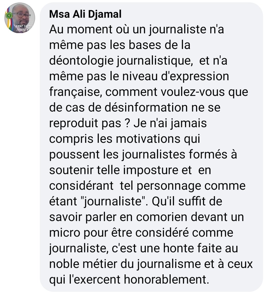 Il faut savoir qu’aux Comores 98% des journalistes n’ont pas fait d’études en école de journalisme. Msa Ali Djamal lui-même qui se prend souvent comme journaliste n’a aucun diplôme en journalisme.