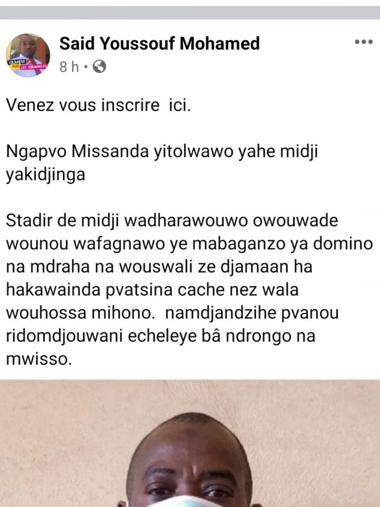 L’activiste Said Youssouf Mohamed est très remonté contre son village natale. Il les traite des ‘<< inconscients >>. Selon lui, les habitants de son village Helendje n’ont pas pris conscience du danger de la deuxième vague de la COVID-19. Ils continuent à mener leur vie, en priant collectivement et en se rassemblant dans les places publiques, comme s’ils étaient immunisés et ne peuvent pas être contaminés par cette pandémie qui ravage le monde en tier. Il l’exprime dans une publication faite ce matin en langue nationale sur le réseau social Facebook:<<Venez vous inscrire ici.