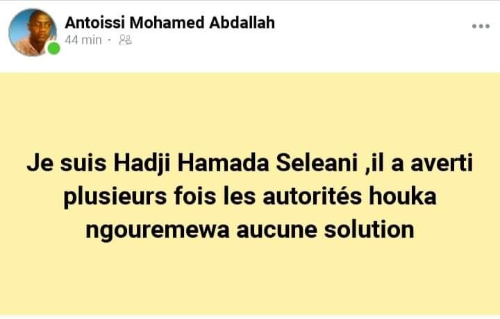 Originaire de Dembeni, Antoissi mohamed Abdallah est la première personne qui a porté ouvertement son soutien à Hadji Ahmada, le mari qui a assassiné l’amant de sa femme : » je suis suis Hadji Ahmada. Il a averti plusieurs fois les autorités uka ngu remewa aucune solution « , a-t-il écrit sur le réseau social Facebook.