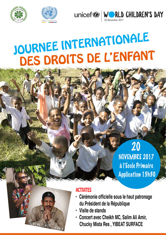 Dans le cadre de la mise en œuvre de l’axe stratégique 5 de cette politique portant sur la communication, l’éducation et la mobilisation pour le changement, le Commissariat National à la Solidarité et à la protection Sociale et à la Promotion du Genre, célébrera avec l’appui technique et financier de l’UNICEF, la journée internationale des droits de l’enfant le 20 novembre 2017. Le 20 novembre constitue un rendez-vous mondial essentiel pour faire vivre les principes de la Convention internationale des droits de l’enfant auprès des enfants et de la population. La journée sera l’occasion pour l’Etat et ses partenaires de donner une grande visibilité aux programmes réalisés en faveur des enfants en Union des Comores. Les enfants de moins de 18 ans représentent une importante composante de la population. Ils sont estimés en 2016 à près de 372.000, soit près de 46% de la population. Cette journée sera célébrée par les enfants et pour les enfants. A cette occasion, les enfants auront là lire dans leurs écoles et collèges du pays, le message du Chef de l’Etat qui leur sera adressé, à visiter les hautes autorités de l’Etat, à animer des émissions de radio et de télévision et prendre part à la cérémonie officielle qui sera organisée à l’école publique Moroni Application (Fundi Said Mnemoi), le 20 novembre 2017 dans l’après-midi. Un concert regroupant les artistes qui ont composé des chansons dédiées aux enfants, notamment Salim Ali Amir et Cheikh MC sera organisé dans l’enceinte de l’école pour clôturer les festivités de la journée.C