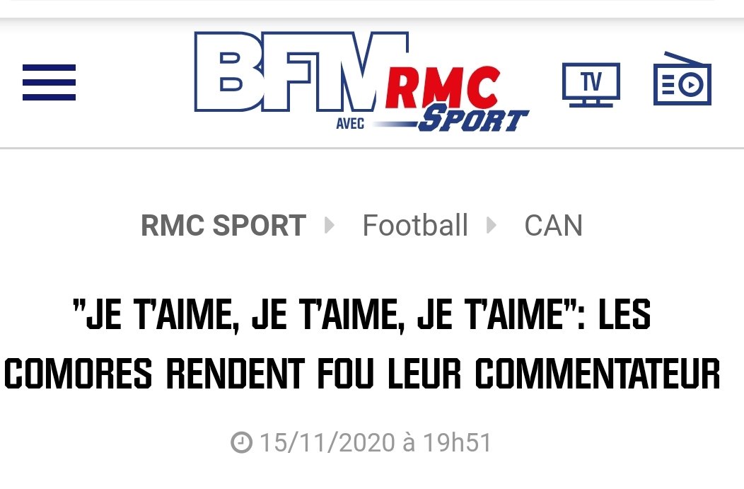 Lors du le but d’El Fardou Ben, le commentateur, Kassim Oumori a laissé exploser sa joie en hurlant pendant de longues secondes « Je t’aime, je t’aime, je t’aime, je t’aime ! ». Son commentaire a fait vibrer les supporters et tout le pays.