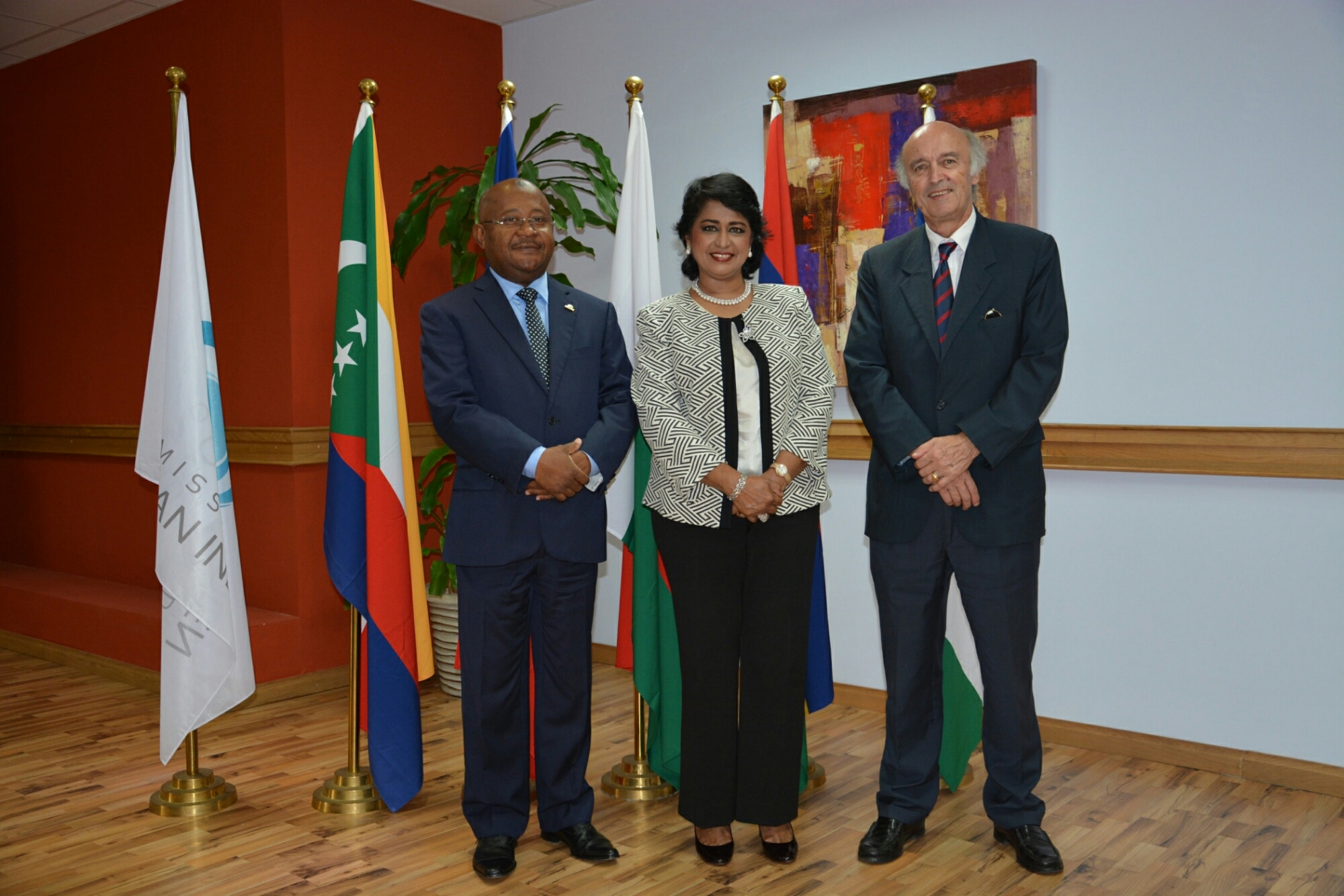 Ebène, Maurice, le 28 octobre 2016 – Le Secrétaire général de la Commission de l’océan Indien (COI), Madi Hamada, a reçu aujourd’hui au siège de la COI le Recteur de l’Agence universitaire de la Francophonie (AUF), Jean-Paul de Gaudemar, pour la signature d’un accord-cadre de coopération entre les deux organisations. La cérémonie s’est déroulée en présence de S.E. Mme Ameenah Gurib-Fakim, présidente de la République de Maurice.