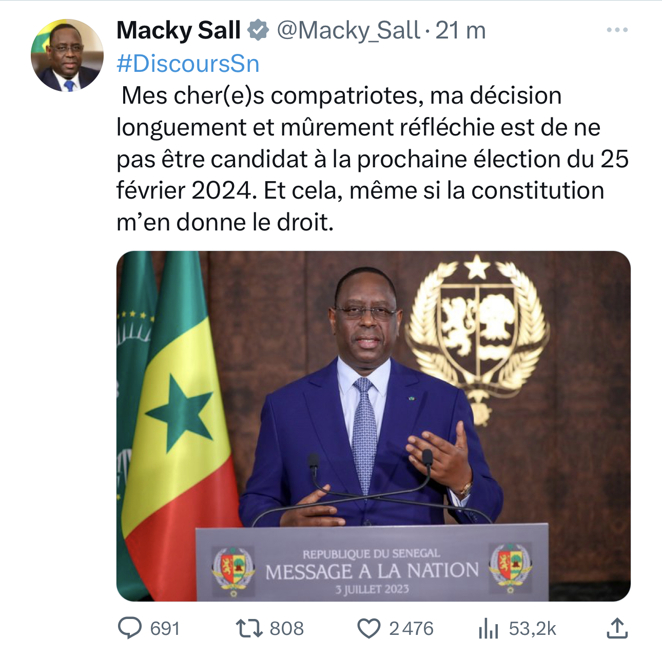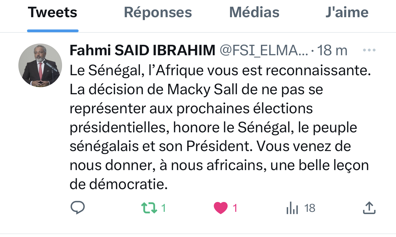 Dans un geste sans précédent, le président sénégalais Macky Sall a annoncé qu’il ne se présenterait pas aux prochaines élections présidentielles de 2024. Cette décision courageuse a suscité une profonde reconnaissance à travers le continent africain. L’ancien ministre des affaires étrangères des Comores, Fahmi Said Ibrahim, a exprimé sur Twitter la gratitude de l’Afrique envers Macky Sall, soulignant que cette décision honorait le Sénégal, son peuple et son président. Elle a également offert à tous les Africains une précieuse leçon de démocratie. https://twitter.com/fsi_elmaceli/status/1675965840301121536?s=46