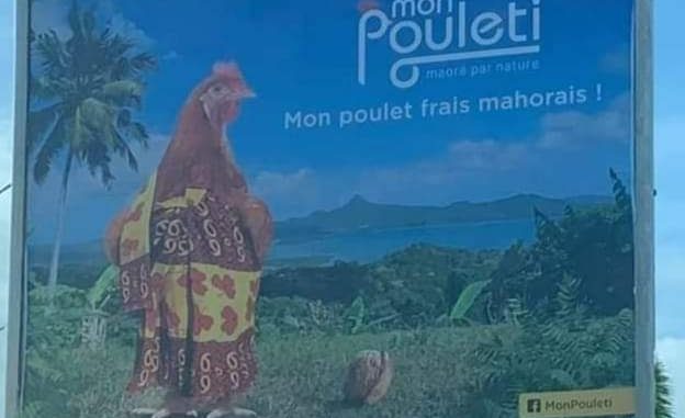Une poule déguisée en femme mahoraise. C’est une publicité pour promouvoir la consommation locale mais la publicité fâche certains mahorais qui voient une humiliation de la femme mahoraise.