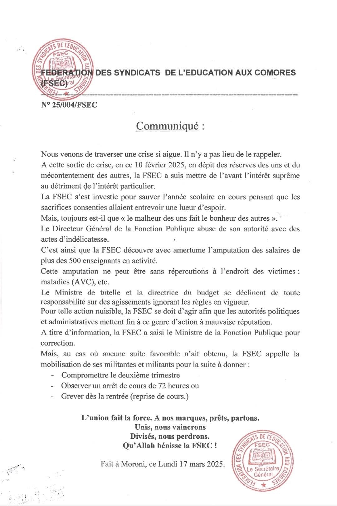 La Fédération des Syndicats de l’Éducation aux Comores (FSEC) tire la sonnette d’alarme face à une injustice flagrante. Plus de 500 enseignants en activité ont vu leurs salaires amputés par la Fonction Publique, sans explication valable. Un acte arbitraire orchestré par le Directeur Général de la Fonction Publique, qui semble se croire au-dessus des lois.