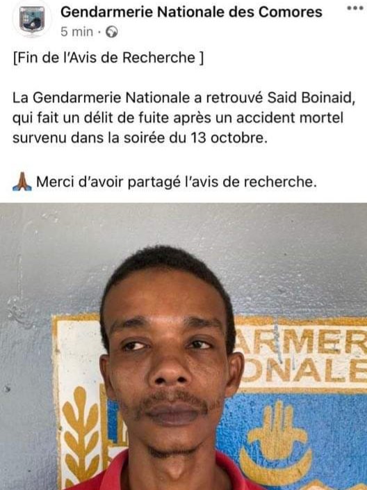 La Gendarmerie Nationale a retrouvé Said Boinaid, qui avait fait un délit de fuite après un accident mortel survenu dans la soirée du 13 octobre. Un avis de recherche a lancé à son encontre au lendemain du drame.