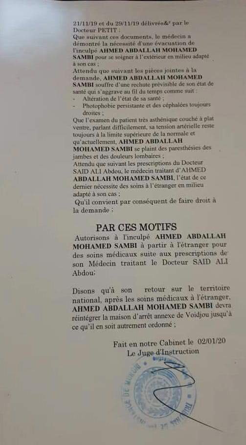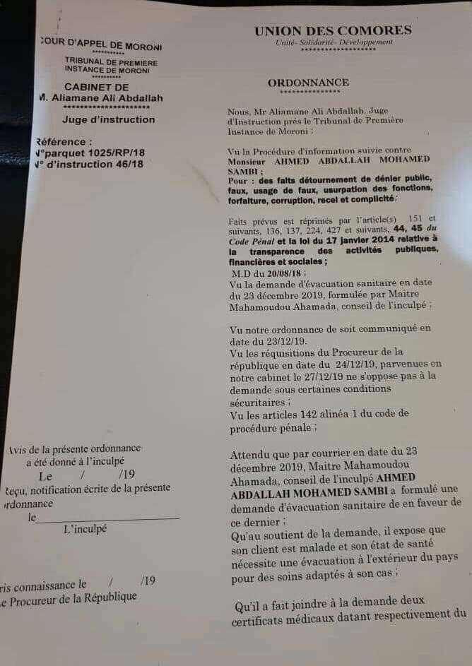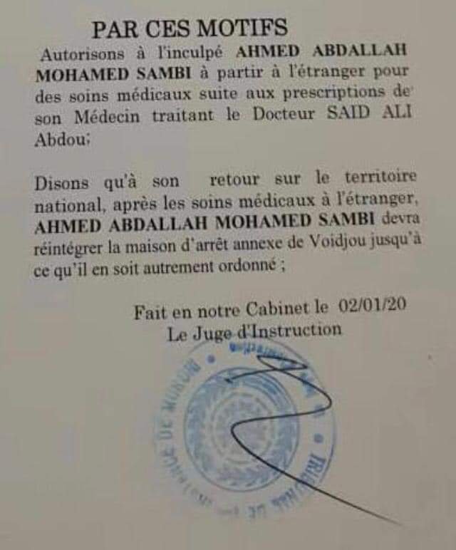 La justice avait donné son feu vert pour que l’ancien président Ahmed Abdallah Sambi aille se faire soigner à l’étranger mais Azali a dit non. Au-dessus des décisions de justice il y’a le président Azali. Contrairement aux affirmations de son discours, le colonel Azali est intervenu sur l’affaire Sambi comme le montre le document ci-dessous :
