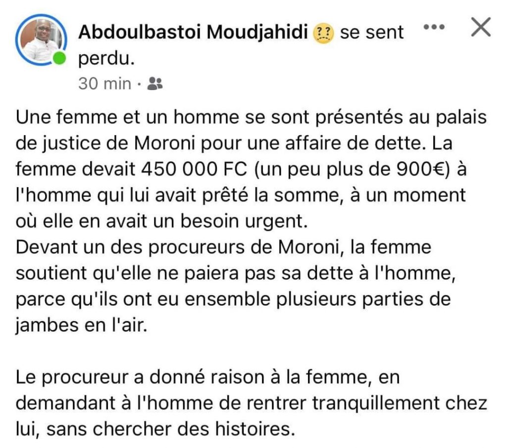« Une femme et un homme se sont présentés au palais de justice de Moroni pour une affaire de dette. La femme devait 450 000 FC (un peu plus de 900€) à l’homme qui lui avait prêté la somme, à un moment où elle en avait un besoin urgent.