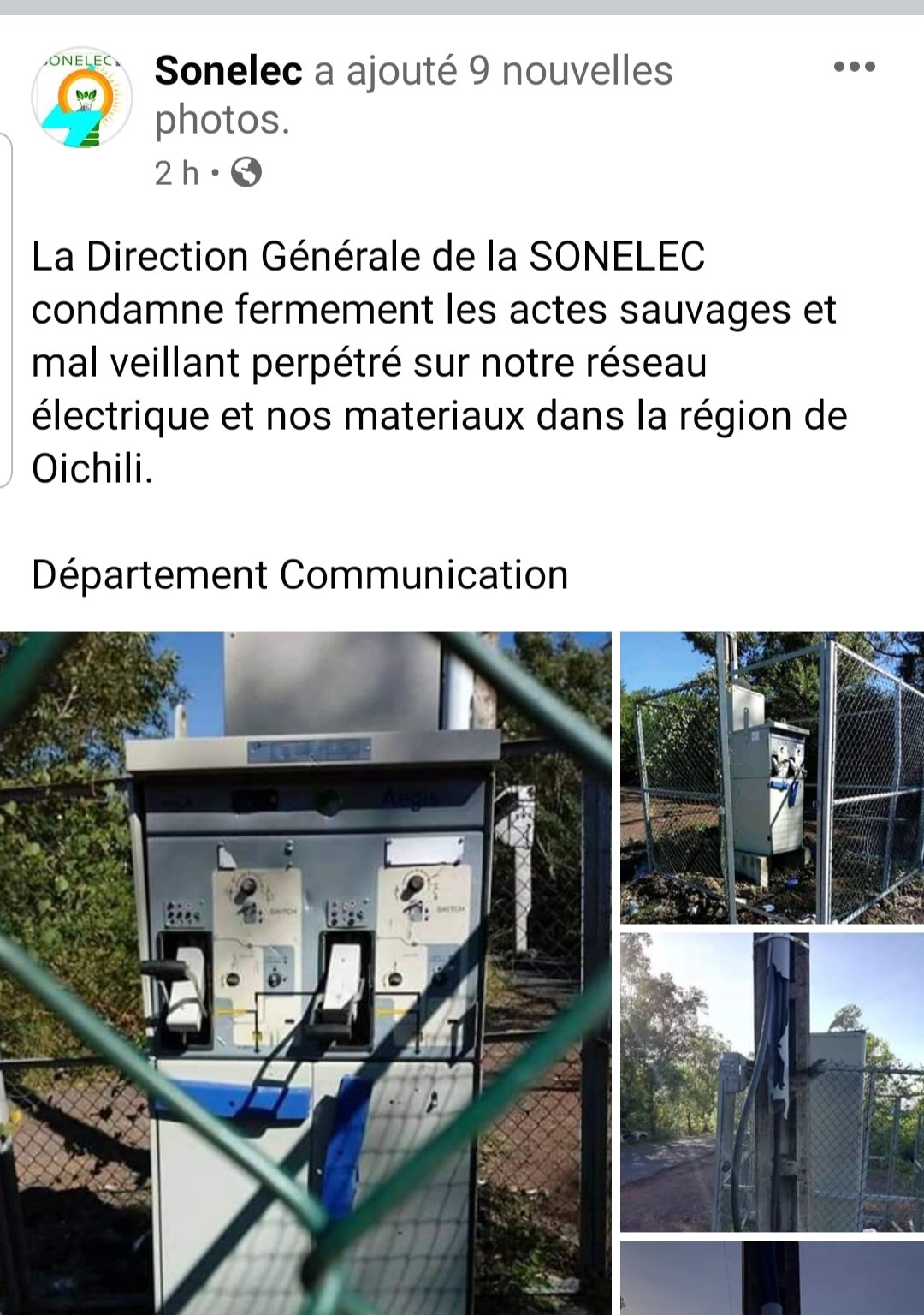 Communiqué de la SONELEC: La Direction Générale de la SONELEC condamne fermement les actes sauvages et mal veillant perpétré sur notre réseau électrique et nos materiaux dans la région de Oichili.