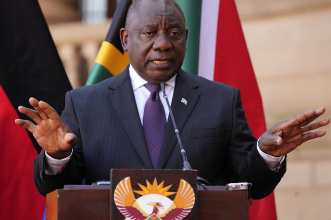 South African President Cyril Ramaphosa speaks during a joint media conference with German Chancellor Olaf Scholz at the Union Building in Pretoria, South Africa, Tuesday, May 24, 2022. (AP Photo/Themba Hadebe)