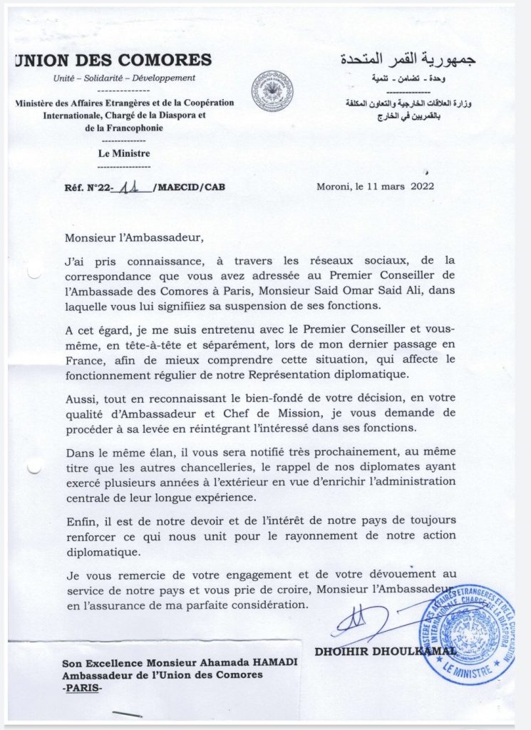 Le ministre des affaires étrangères en charge de la diaspora DHOIHIR DHOULKAMAL a demandé à l’ambassadeur des Comores à Paris de réintégrer le premier conseiller à son poste. Mais Ahamada Hamadi n’a pas donné une suite favorable à son supérieur hiérarchique.