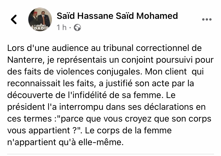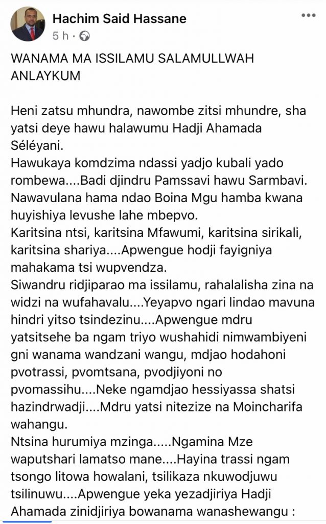 Il a fait une alerte sur sa page Facebook. Alors que le pays entier ne s’est pas encore remis du crime passionnel commis à Seleani dans le Hamahamet dimanche dernier, l’ancien candidat à la présidentielle de 2016 Hachim Said Hassane, fils de l’ancien ambassadeur des Comores à Paris Said Hassane Said Hachim, vient de publier une mise en garde sur sa page Facebook. Il averti qu’il a un coutelas qu’il aiguise chaque matin, au moyen duquel il s’en prendra à l’éventuel amant de sa femme. Une prise de position très dangereuse qui risque d’entraîner d’autres adeptes. Beaucoup sont ceux qui sont heurtés par ces propos. Son demi-frère Said Mohamed qui est avocat à Paris a tenu à publier une anecdote d’une des affaires qu’il avait en charge au barreau de Paris, dans l’espoir peut-être de le ramener à la raison : « Lors d’une audience au tribunal correctionnel de Nanterre, je représentais un conjoint poursuivi pour des faits de violences conjugales. Mon client qui reconnaissait les faits, a justifié son acte par la découverte de l’infidélité de sa femme. Le président l’a interrompu dans ses déclarations en ces termes : »parce que vous croyez que son corps vous appartient ? ». Le corps de la femme n’appartient qu’à elle-même », a-t-il tenu à rappeler.
