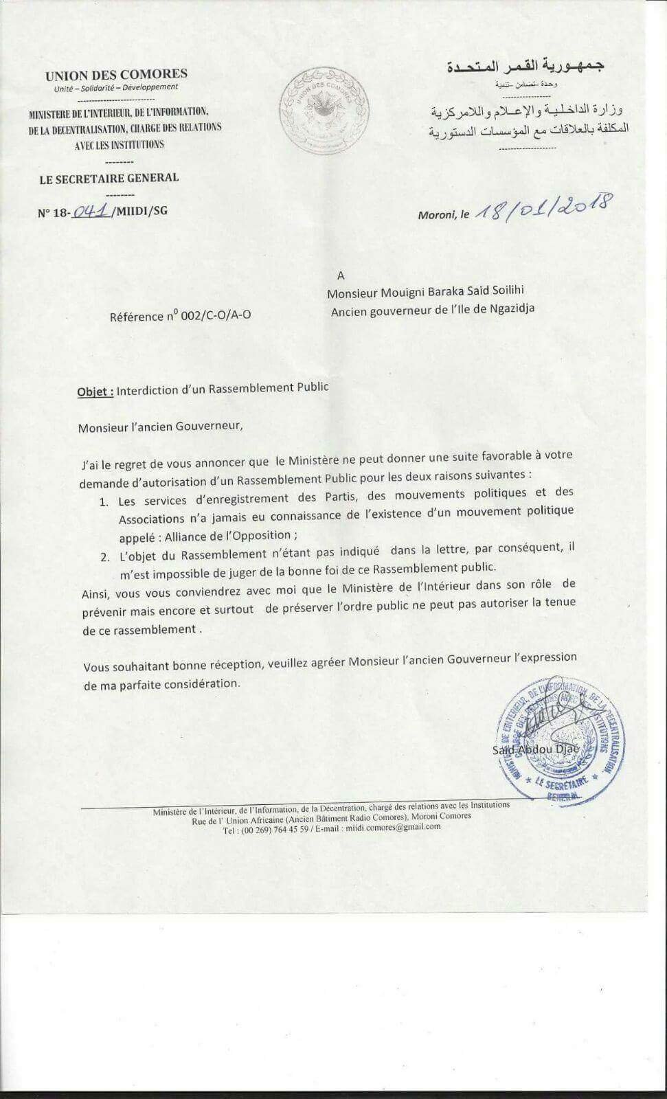 Le ministère de l’intérieur a interdit à l’ancien gouverneur Mouigni Baraka d’organiser une manifestation.