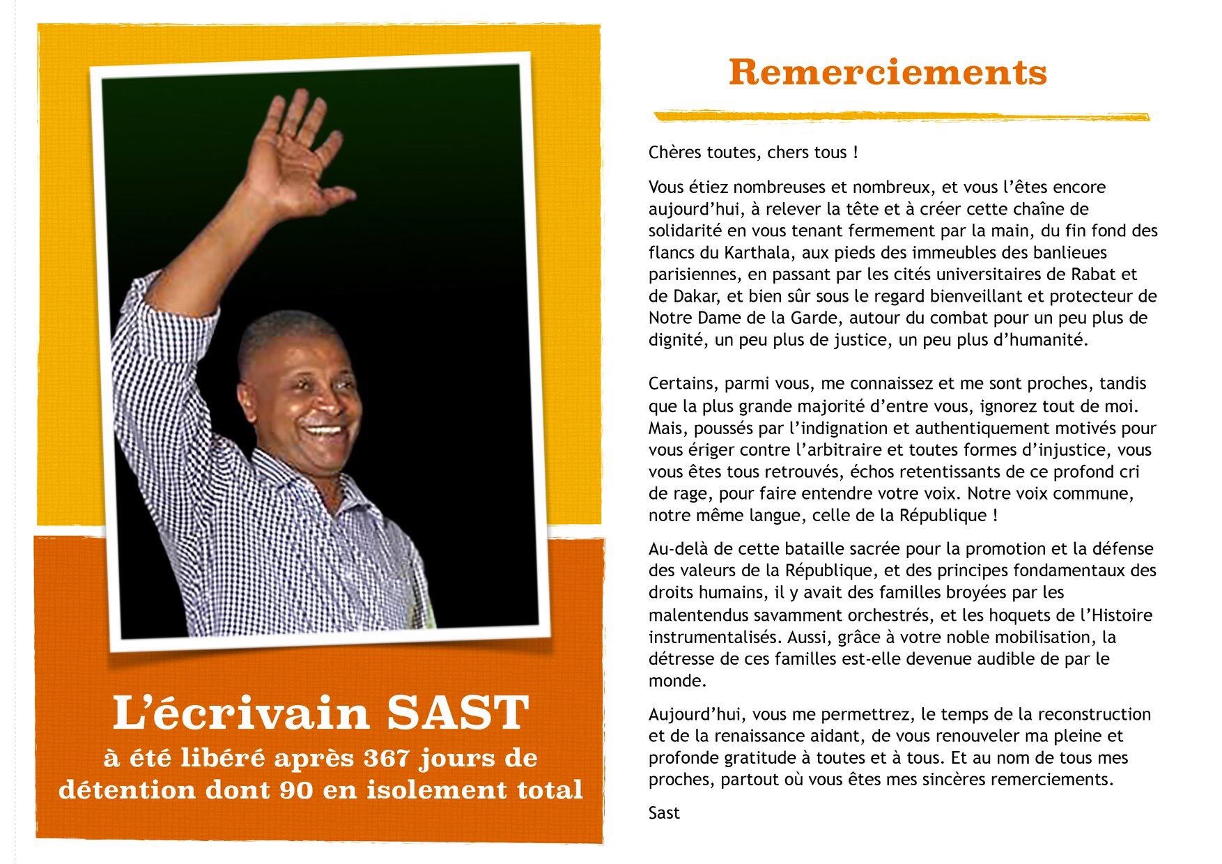 Un peu plus d’un mois après sa libération, l’écrivain Said Ahmed Said Tourqui qui se trouve actuellement en soins et continue sa « reconstruction » après 367 jours d’incarcération dont 90 en isolement totale, vous adresse ses chaleureux remerciements à retrouver ci-dessous.