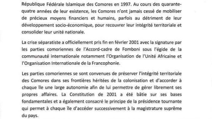 Voici la Communauté Internationale qui va assister impuissante au simulacre de référendum d’Azali. Mais, nous espérons que la Communauté Internationale réagira sévèrement en faveur de la raison contre l’aveuglement d’Azali. Azali se trompe mais, moi j’ai confiance que par la grâce d’Allah, la raison triomphera et l’erreur (le faux) disparaîtra incha Allah…