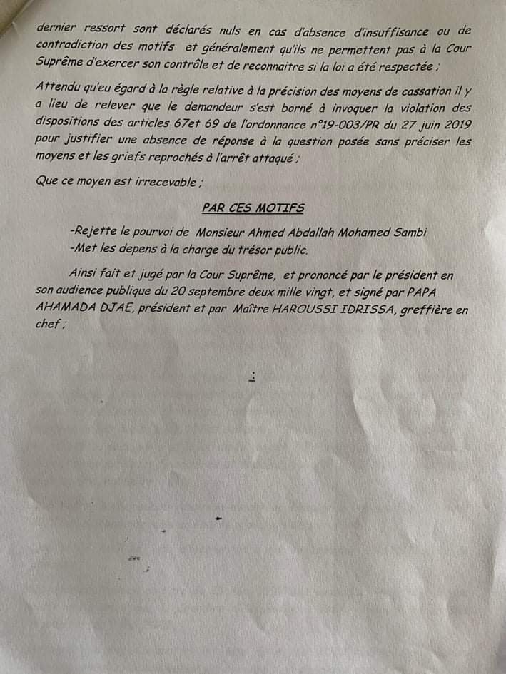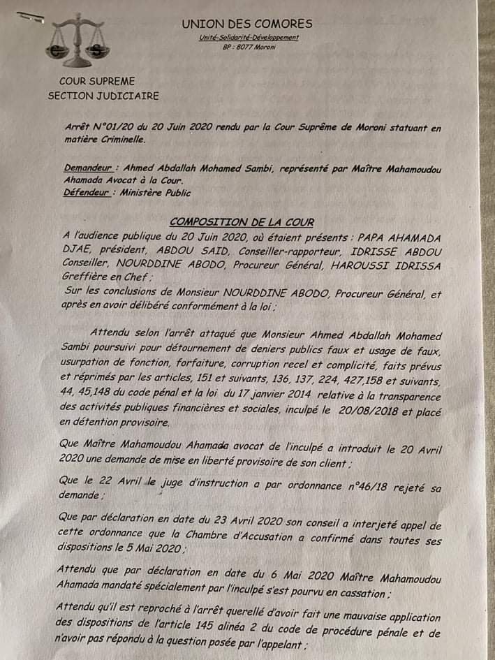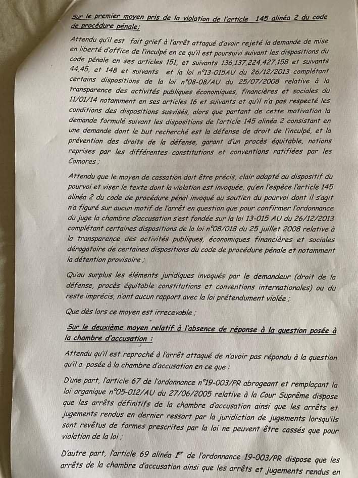 Voici ce qu’a dit l’arrêt. Alors que Me Mahamoud a exercé un pourvoi contre l’arrêt de la chambre d’accusation qui a confirmé l’ordonnance rejetant la demande de mise en liberté provisoire, il a évoqué, au soutien de son argument, des moyens relevant du rejet d’une demande de mise en liberté d’office(lire l’arrêt) et non les moyens se fondant sur une demande de mise en liberté provisoire comme ça devait être le cas. Cela nous conduit à faire la distinction, à nouveau, entre une demande de mise en liberté provisoire qui peut être demandée à tout moment et qui dépend de l’appréciation souveraine du juge. Quant à la liberté d’office, elle ne donne pas de marge d’appréciation au juge puisque c’est la loi qui impose la liberté d’office, dès lors, que la loi prescrivant le délais ne pouvant excédé 8 mois eut été volée. Me Mahamoud Ahamada, en omettant de se pourvoir en cassation en avril 2019 pour se faire prévaloir de ce moyen légal pour obtenir la liberté d’office de Sambi, a incontestablement privé son client de bénéficier en Avtil 2019 d’une liberté d’office découlant de la loi. Or justement, la cour de cassation a pour vocation d’exercer un contrôle sur la bonne interprétation et la bonne application de la loi. Il est vrai que Me Mahamoud Ahamada en Avril 2019, était dans une autre logique, une logique politique de couroucourou. A ce titre, il ne pouvait saisir couroucourou pour demander la liberté d’office de son client. Une occasion en or ratée. De ce point de vue, Yhoulam Athouman a effectivement raison. Il appartient maintenant à Me Mahamoud Ahamada de nous prouver le contraire en produisant l’arrêt de la cour suprême rejetant le pourvoi contre l’arrêt de la chambre d’accusation qui a refusé la liberté d’office demandée. Cet arrêt n’existe pas en réalité pour la simple raison que Me Mahamoud Ahamada n’a pas saisi la cour suprême quand il fallait, soit en Avril 2019. Toutes ces omissions n’ont fait que favoriser le pourvoir. L’on se demande comment Me Ahamada Mahamoud a pu manquer de concentration dans un dossier comme celui-ci.