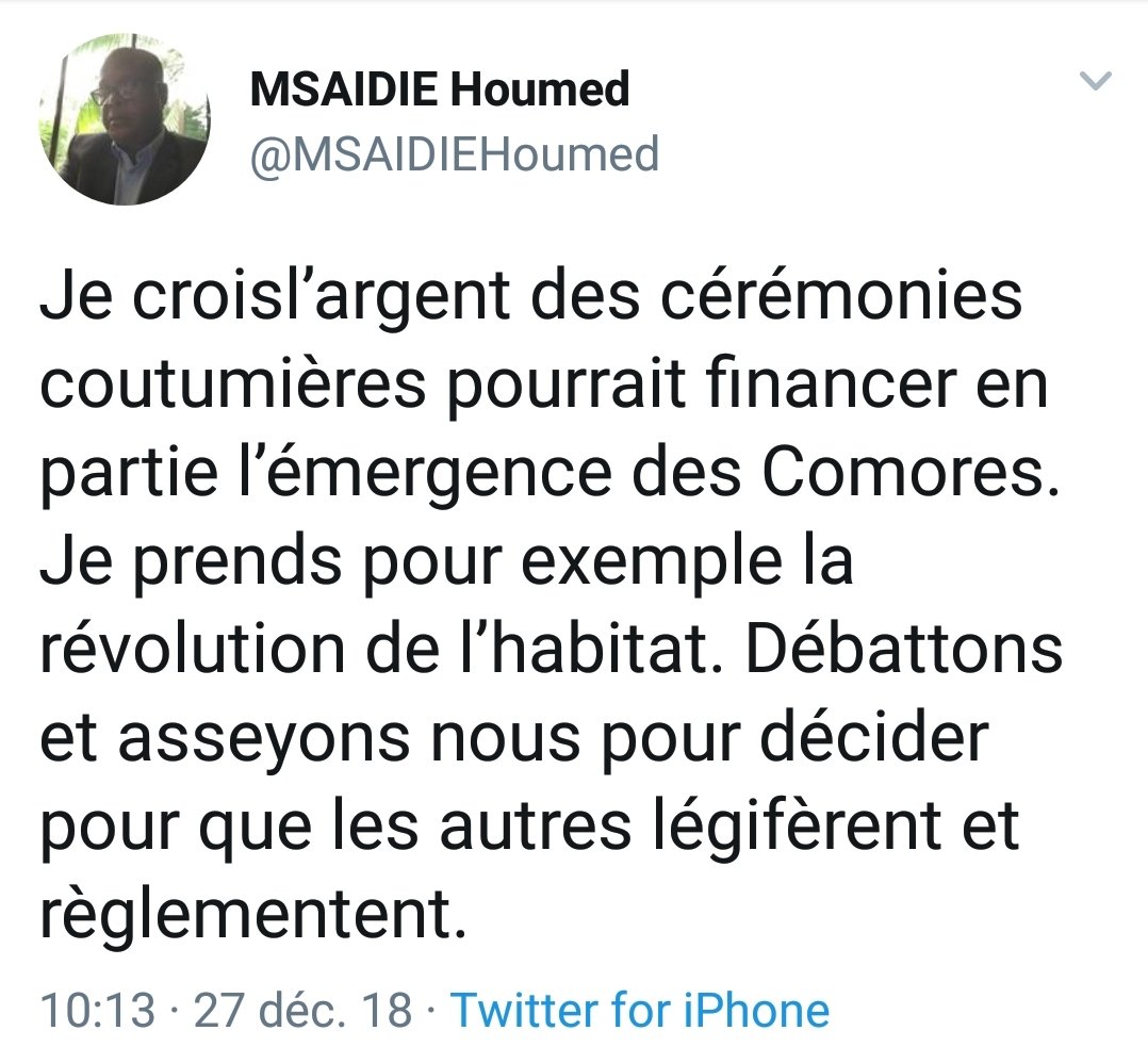 L’ ancien ministre de l’Intérieur, Houmed Msaidié ne manque pas d’idée pour financer l’émergence du président Azali. C’est sur Twitter qu’il propose de financer l’émergence grâce au grand mariage.