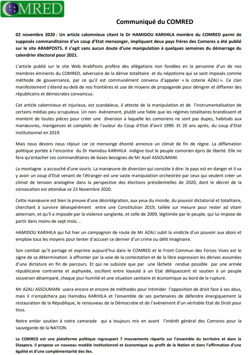 Une information selon laquelle Karihila et Me Mahamoud veulent faire un coup d’état aux Comores, est complètement fausse. Le blog en question collabore avec des partisans d’Azali qui ont monté cette fausse information suite au voyage de Me Mahamoud en Afrique.