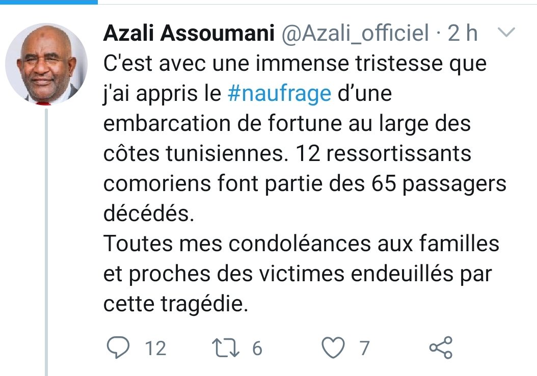 Le compte Twitter d’Azali a présenté ses condoléances. Le service de communication de Beit-salam a fini par présenter ses condoléances aux familles des 12 jeunes Comoriens décédés. Oui ce n’est pas Azali qui gère son compte Twitter lui-même mais son conseiller à la communication, Aziz Mchangama.