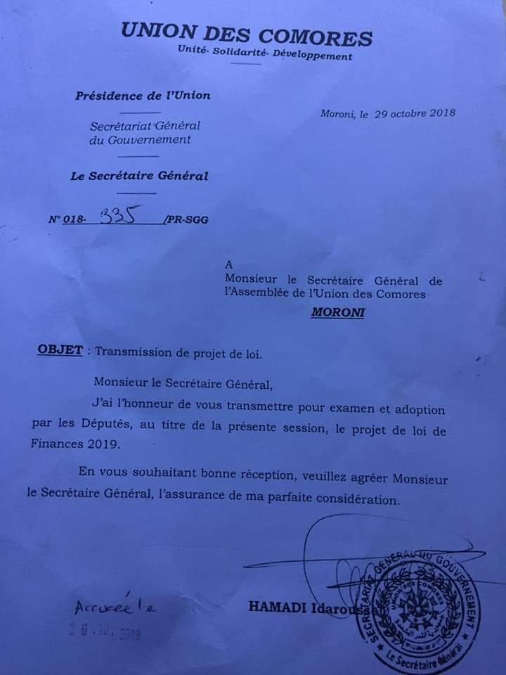 Le député Oumri avait affirmé dans un article publié sur notre site que le gouvernement n’avait pas un projet de loi de finance. Lire plus :https://www.comoresinfos.net/a-partir-du-1er-janvier-2019-les-comores-vont-traverser-des-turbulences-financieres/
