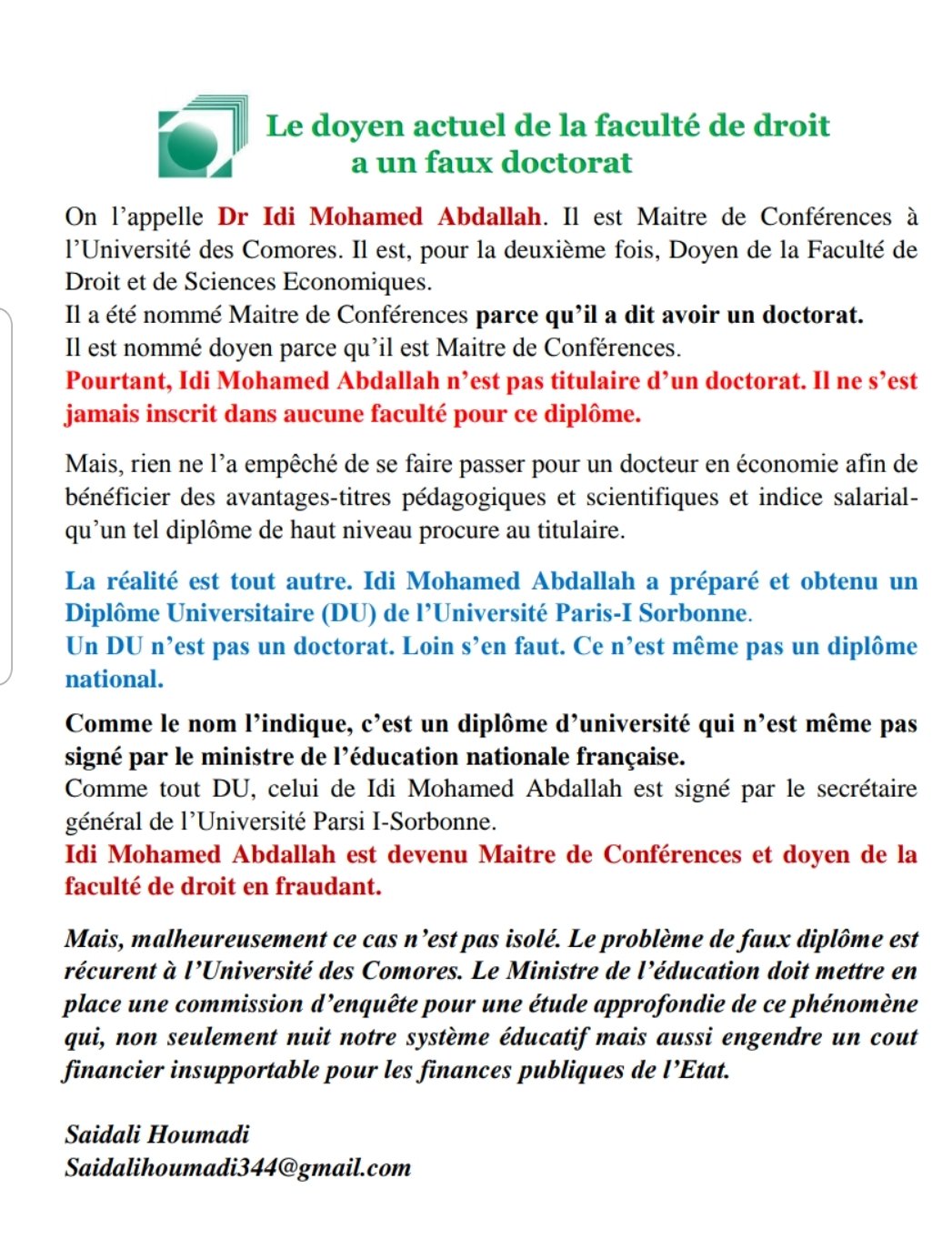 Un faussaire avec un faux diplôme à la tête de la faculté de droit aux Comores. Une information que confirme le Dr Saidali Hamadi dans un article dont ce dernier nous a envoyé.