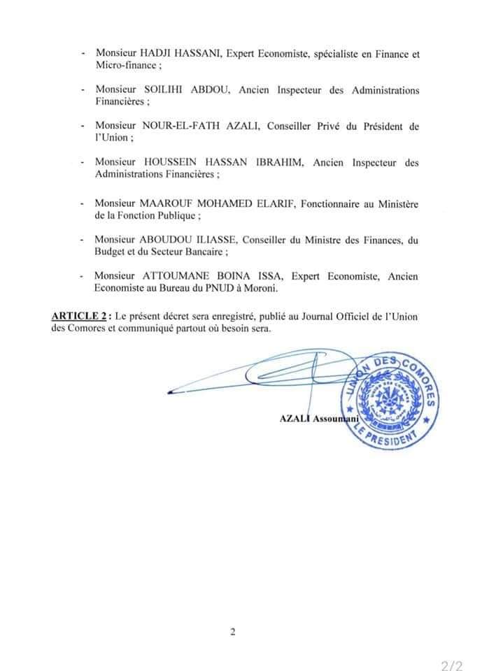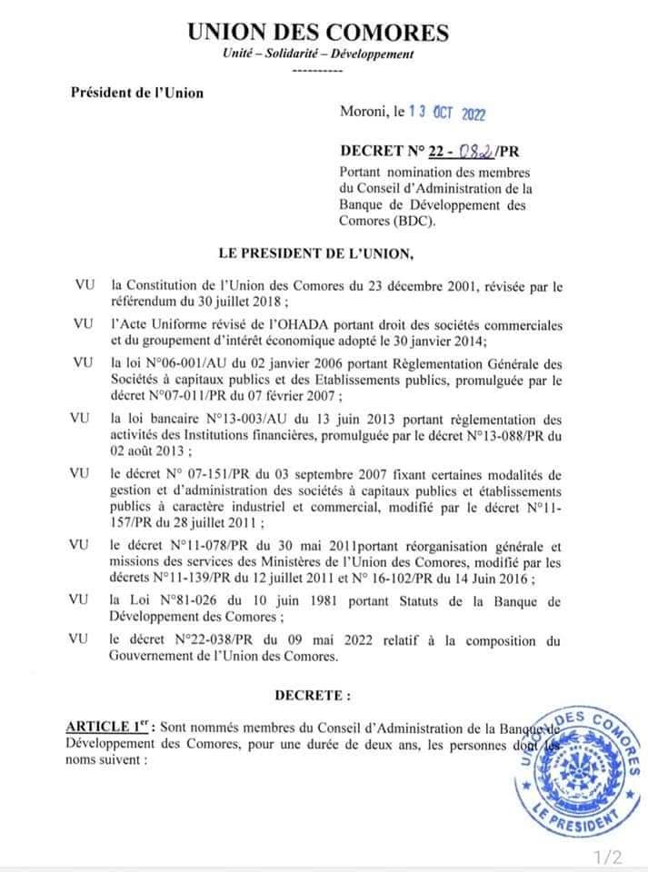 Le fils du président Azali Assoumani, Nour El Fath Azali est nommé au conseil d’administration de la BDC. Un avenir financier assuré pendant les années à venir.