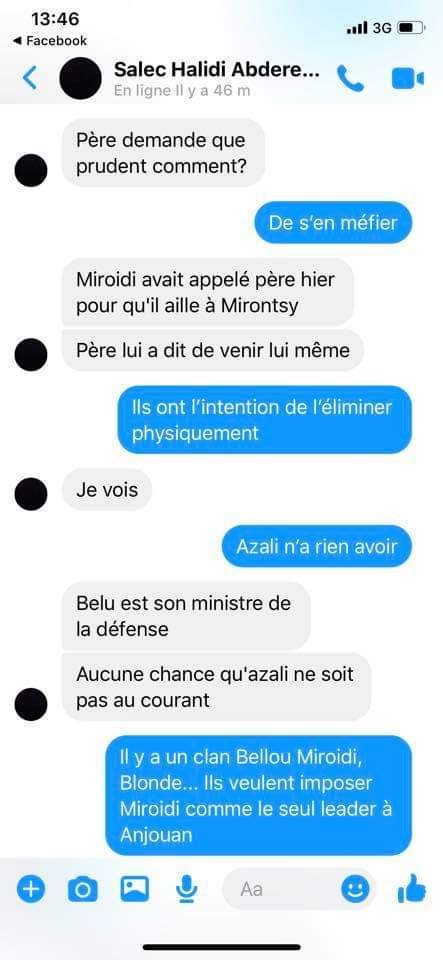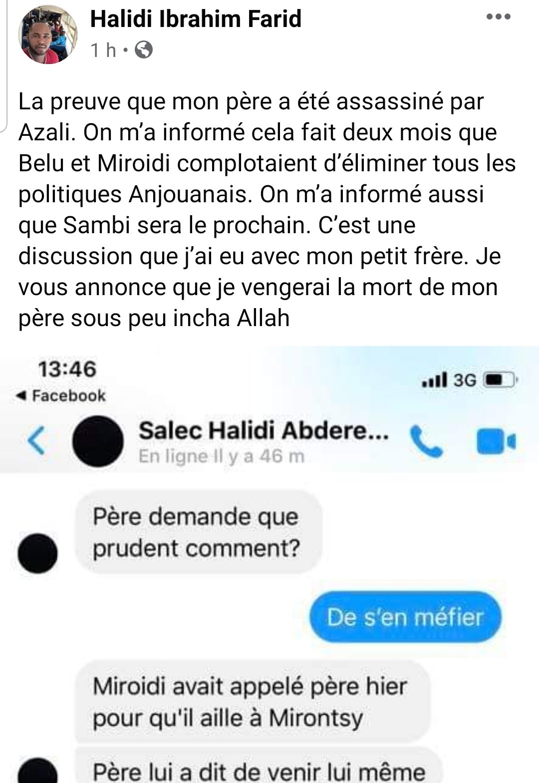 La colère de la famille de l’ancien premier ministre Ibrahim Halidi Abderemane ne retombe pas. Il faut dire que le traitement qu’a eu l’ancien premier ministre est déplorable. Le fils de Ibrahim Halidi promet de venger son père sous peu de temps. C’est sur Facebook qu’il a publié son message.