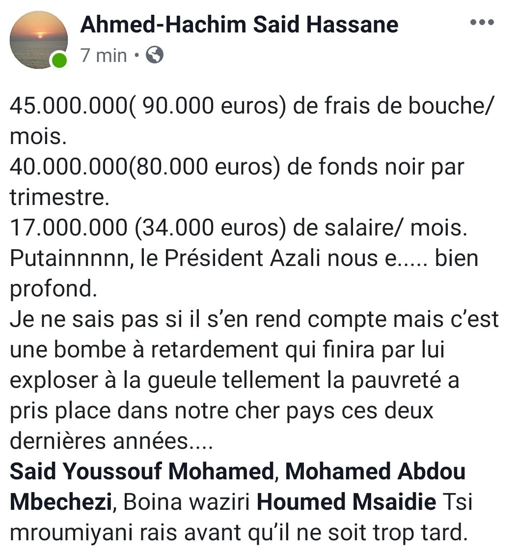 Le fils de l’ancien ministre Said Hassane Said Hachim accuse le président Azali Assoumani d’utiliser l’argent de l’état comme il le veut et il donne des chiffres bien précis. C’est sur Facebook qu’il a fait ses révélations.