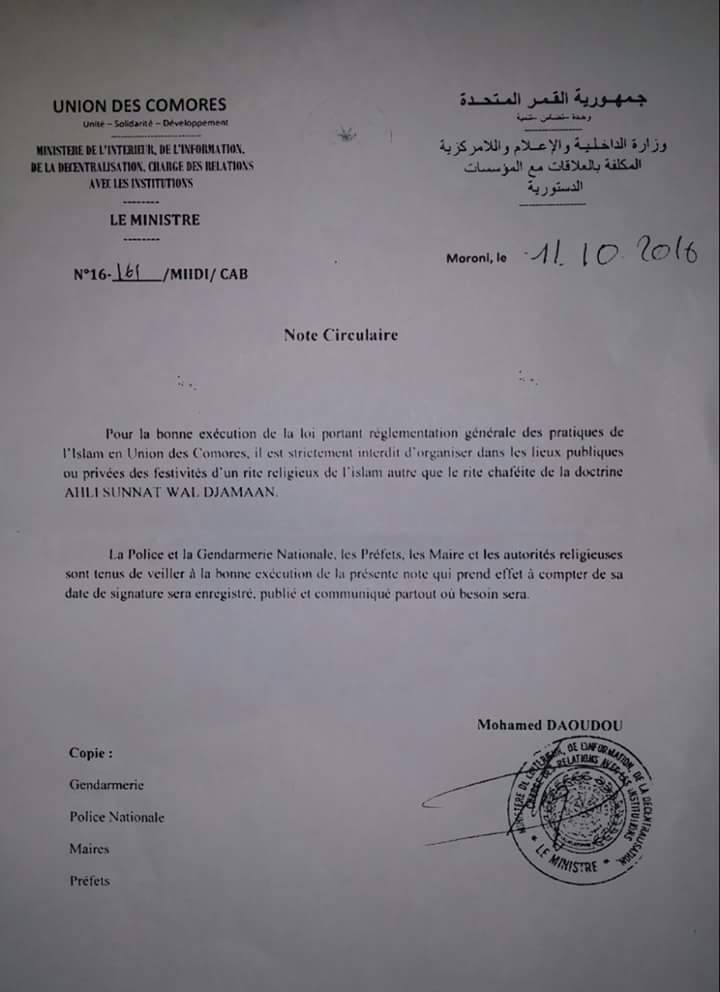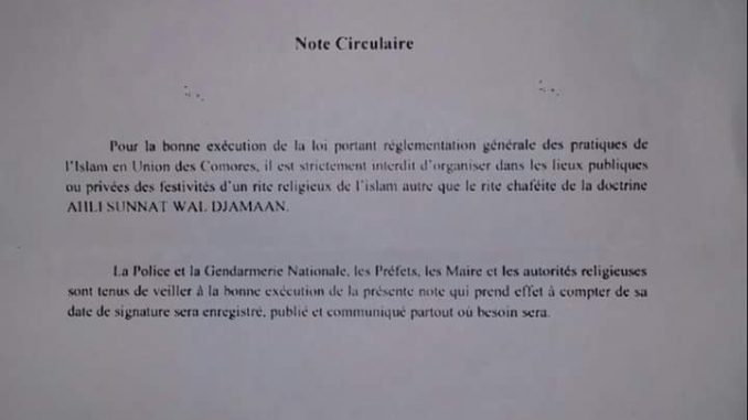 Dans une note circulaire parue le 11 octobre et signée par le ministère de l’intérieur, il a été rendu public que toutes les manifestations et autres organisations religieuses de confession autre qu’Ahli sunnah wal djamaan sont interdites en Union des Comores.