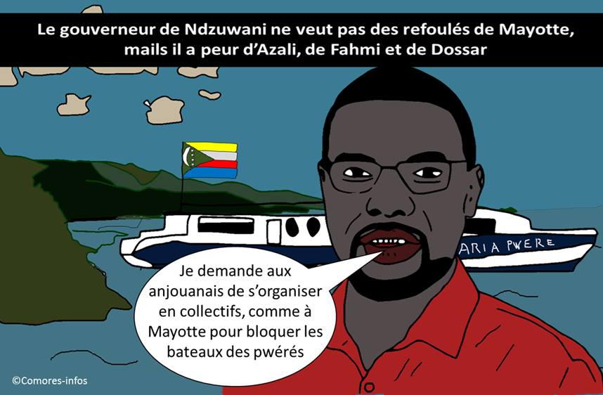 Dessin Satirique. Selon des informations dignes de foi, le gouverneur de Nzuwani souhaiterait que la population anjouanaise s’empare des cas des refoulés de Mayotte, en s’organisant en collectifs pour empêcher l’accueil de ces refoulés. C’est que le gouverneur ignore, contrairement aux collectifs mahorais qui bénéficient d’une impunité totale malgré leurs actes criminels, les collectifs anjouanais seront réprimés par l’Imam malgré leurs actions légalement humanitaires.