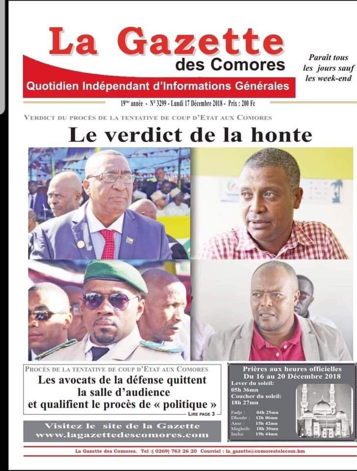 Dans une conférence de presse le ministre de la Justice a annoncé avoir ordonné le procureur à poursuivre La Gazette des Comores et un avocat pour « outrage » à magistrat. « Le verdict de la honte » ce titre d’un article du journal n’a pas du tout été du gout du gouvernement. Regardez la conférence ci-dessous et la déclaration du ministre :
