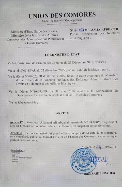 Dans un arrêté en date du 14 juin, le ministre de la Justice, Fahmi Said Ibrahim suspend Aliamani Ali Abdallah de ses fonctions de magistrat et juge au tribunal de première instance de Moroni. Dans une conférence de presse à Moroni, le patron de l’hôtel Retaj l’avait accusé d’avoir fait irruption dans son établissement et importuné l’un de ses clients. Pour le ministre, ces faits relatés dans la presse nationale sont graves et ‘‘pour la sérénité de l’institution, il était normal de le suspendre’’.