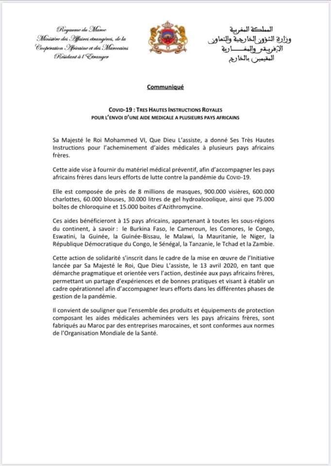 Le Maroc va fournir du matériel médical préventif à plusieurs pays africains dont les Comores selon un communiqué du ministère des affaires étrangères marocain. Ceci entre dans la lutte contre la pandémie mondiale. Il s’agit de visières, de masques, de charlottes, de gel, de chloroquine et d’azithromycine.