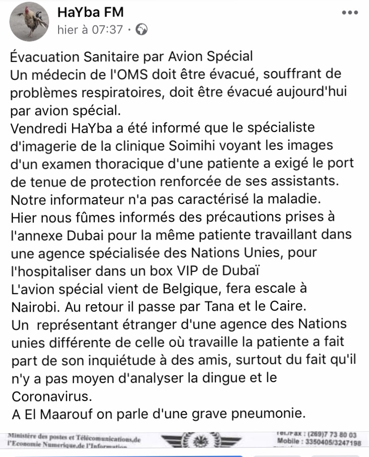 Hier dimanche dans la matinée, la Radio Hayba FM avait révélé qu’un médecin de l’OMS souffrant de problèmes respiratoires allait être rapatriée à l’extérieur pour des soins intensifs. L’aviation civile avait bel et bien émis une dérogation permettant au vol spécial des Nations Unies de venir embarquer le médecin question. Chose qui n’a pas pu avoir lieu, faute de timing du côté des Nations Unies, et le vol pourrait avoir lieu ce lundi. Selon nos informations, le docteur en question est de nationalité comorienne, issue de l’île de Ngazidja. Nous nous gardons de citer sa localité d’origine et encore moins son prénom pour éviter qu’elle soit facilement identifiable. Nous vous invitons à lire ci-dessous l’article de Hayba FM, d’hier dimanche: