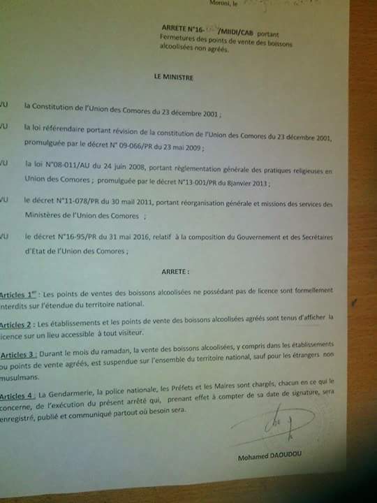 Le ministre de l’intérieur Mohamed Daoudou alias kiki vient d’interdire la vente d’alcool pendant le mois sacré de Ramadan.