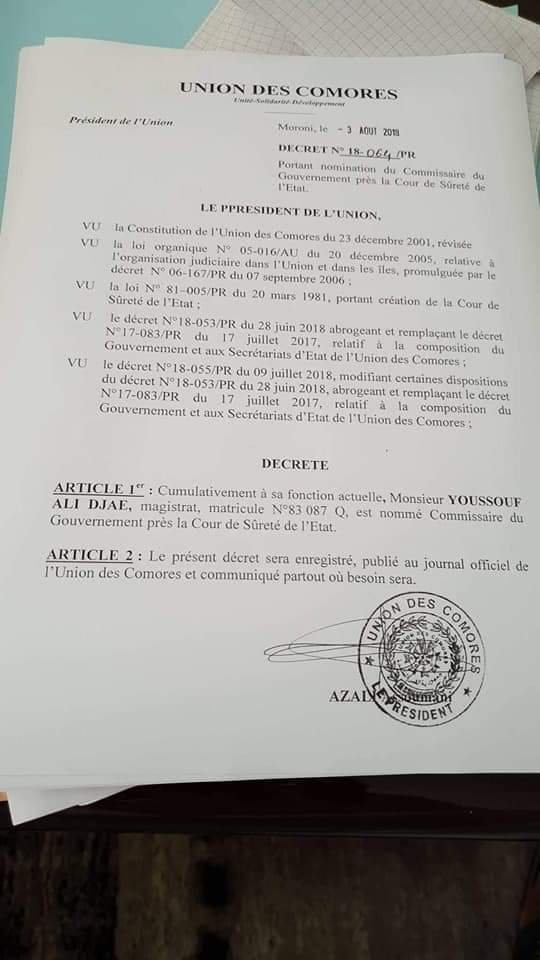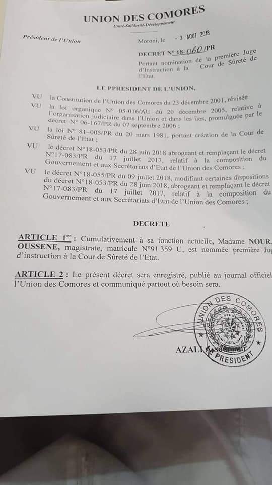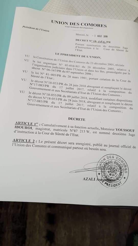 L’ancien président de l’Assemblée de l’Union, Abdou Ousseni, alors ministre de la justice, nous avait pourtant prévenu sur la personnalité de celui qui deviendra plus tard, à notre grand malheur, ministre de la justice. En effet, lorsque Abdou Ousseni était ministre de la justice,il avait suspendu le bandit Mohamad Ousseni Djamalilaili autrefois procureur. Dans sa déclaration justifiant cette sanction disciplinaire, il avait dit que cet homme est « indigne d’occuper une quelconque responsabilité dans une institution judiciaire ».
