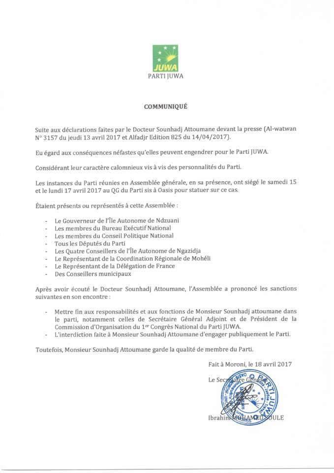 Le parti Juwa met fin aux fonctions du docteur Sounhadji dans un communiqué
