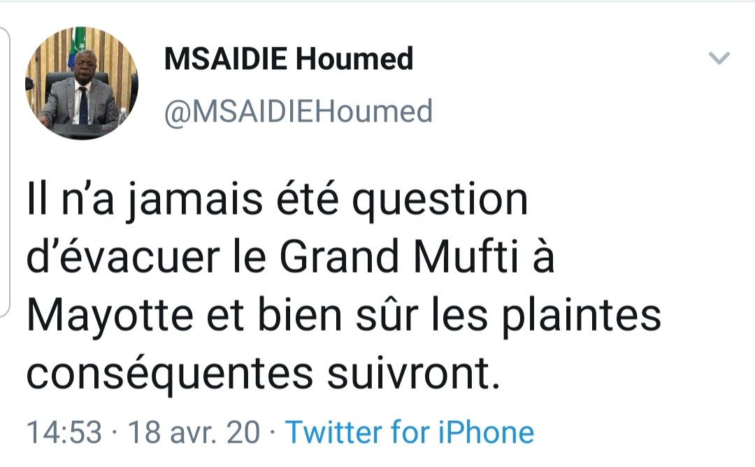 Il vient d’annoncer sur Twitter que des plaintes contre ceux qui ont divulgué l’information selon laquelle le mufti serait mort du Coronavirus, et qu’il était sur le point d’être évacué à mayotte : » il n’a jamais été question d’évacuer le grand mufti à mayotte et les bien sûr les plaintes conséquentes suivront « , Houmedi Msaidié. Une énième annonce. Il avait déclaré qu’il allait porter plainte contre Comores infos et La gazette. Ces deux médias indépendants avaient révélé que 3 échantillons de 3 cas suspects envoyés à Ngazidja pour des analyses ont été mis dans les tiroirs. Cette plainte n’a jamais été déposée. Aujourd’hui, Houmedi Msaidié risque de commettre la même erreur.