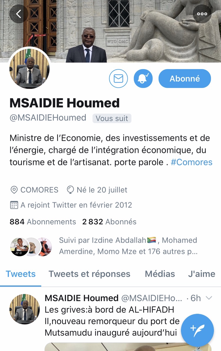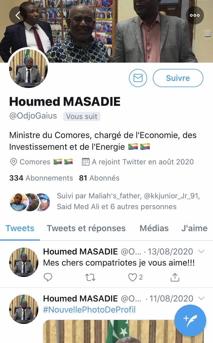 Il a fait de Twitter son nouveau domaine de prédilection après avoir fuit Facebook où il a excellé pendant plusieurs années. Le ministre de l’Économie et porte-parole du gouvernement comorien n’échappe pas est loin de profiter du répit qu’il espérait sans doute. Son compte possède déjà un jumeau. Depuis le mois d’août qu’il est créé, le vrai faux compte comptabilise près de 90 abonnés contre environ 3000 pour le vrai. Ceux qui s’y connaissent dans les réseaux sociaux ne devraient pourtant pas être dupes. Sans compter les fautes grossières sur la partie biographie, le mot dièse qui apparaît quand le compte est identifié est révélateur dans le vrai faux compte car c’est « OdjoGaius » contre « MSAIDIEHoumed » dans le vrai compte. Prudence.