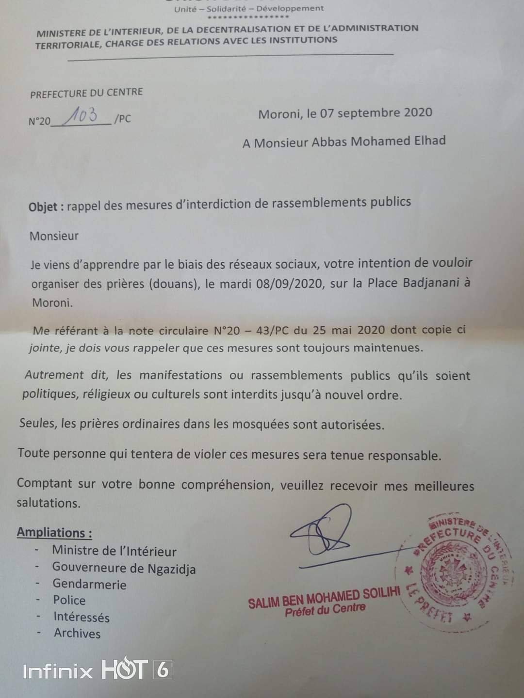 Dans un courrier adressé à l’ancien ministre de la justice et conseil à la mairie de Moroni Abbas Elhad, le préfet du centre, sous les ordres du ministre de l’intérieur Mohamed Daoud, l’organisation des prières qui devaient se tenir demain à la place de Badjanani par les notables de Moroni. Un douan qui avait pour objectif d’implorer le bon Dieu de venir au secours à la ville.