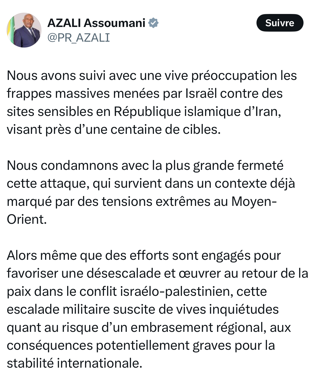 « Nous avons suivi avec une vive préoccupation les frappes massives menées par Israël contre des sites sensibles en République islamique d’Iran, visant près d’une centaine de cibles », a déclaré le président Azali, dénonçant une action militaire d’une ampleur inédite qui, selon lui, menace dangereusement l’équilibre régional.